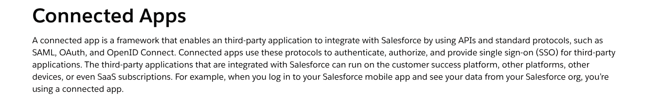 Salesforce Connected App官方文档: https://help.salesforce.com/s/articleView?id=xcloud.connected_app_overview.htm&type=5