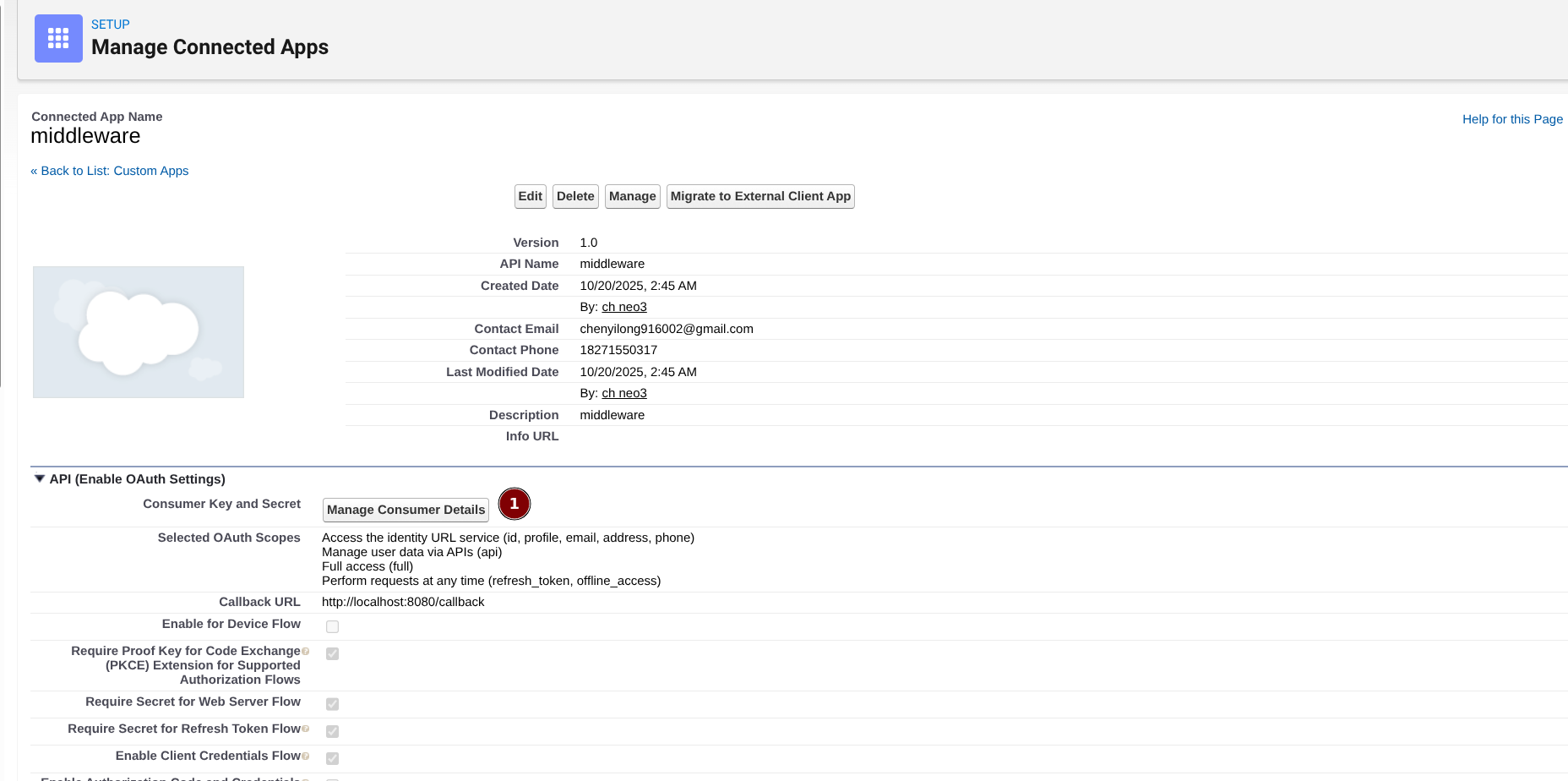 该应用会提供 client_id 与 client_secret,它们是外部系统访问 Salesforce API 的 “门卫” 与 “钥匙”。