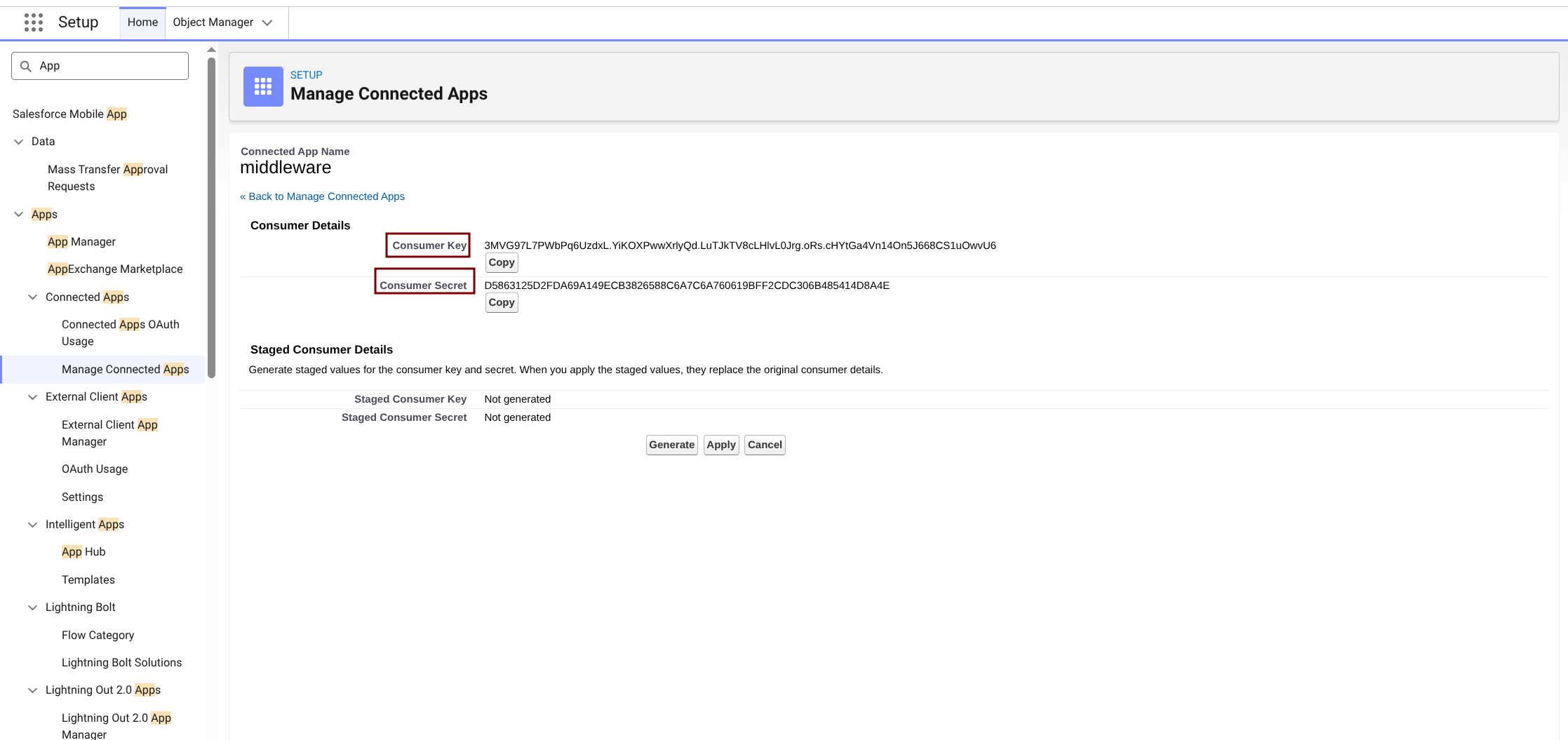 提交后进入 manage connected app (找到刚刚创建的app) 点击manage consumer details